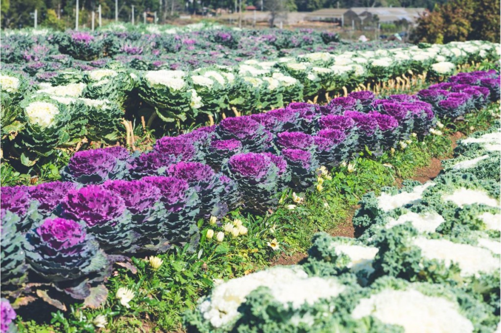 O repolho ornamental é uma variedade que possui folhas mais grossas e uma coloração interessante. Cresce em forma de roseta e, quando maduro, exibe um degradê muito bonito de tons arroxeados. É da mesma família dos brócolis, couve-flores e couves, porém, não é comestível.